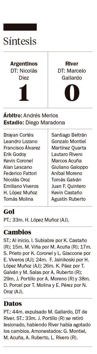 River sigue en caída libre. No encuentra el rumbo futbolístico y su entrenador Marcelo Gallardo empieza a caminar por la cornisa. Anoche, en un partido de mucha fricción, perdió 1-0 en La Paternal ante Argentinos Juniors, que volvió a sumar de a tres luego de tres fechas.