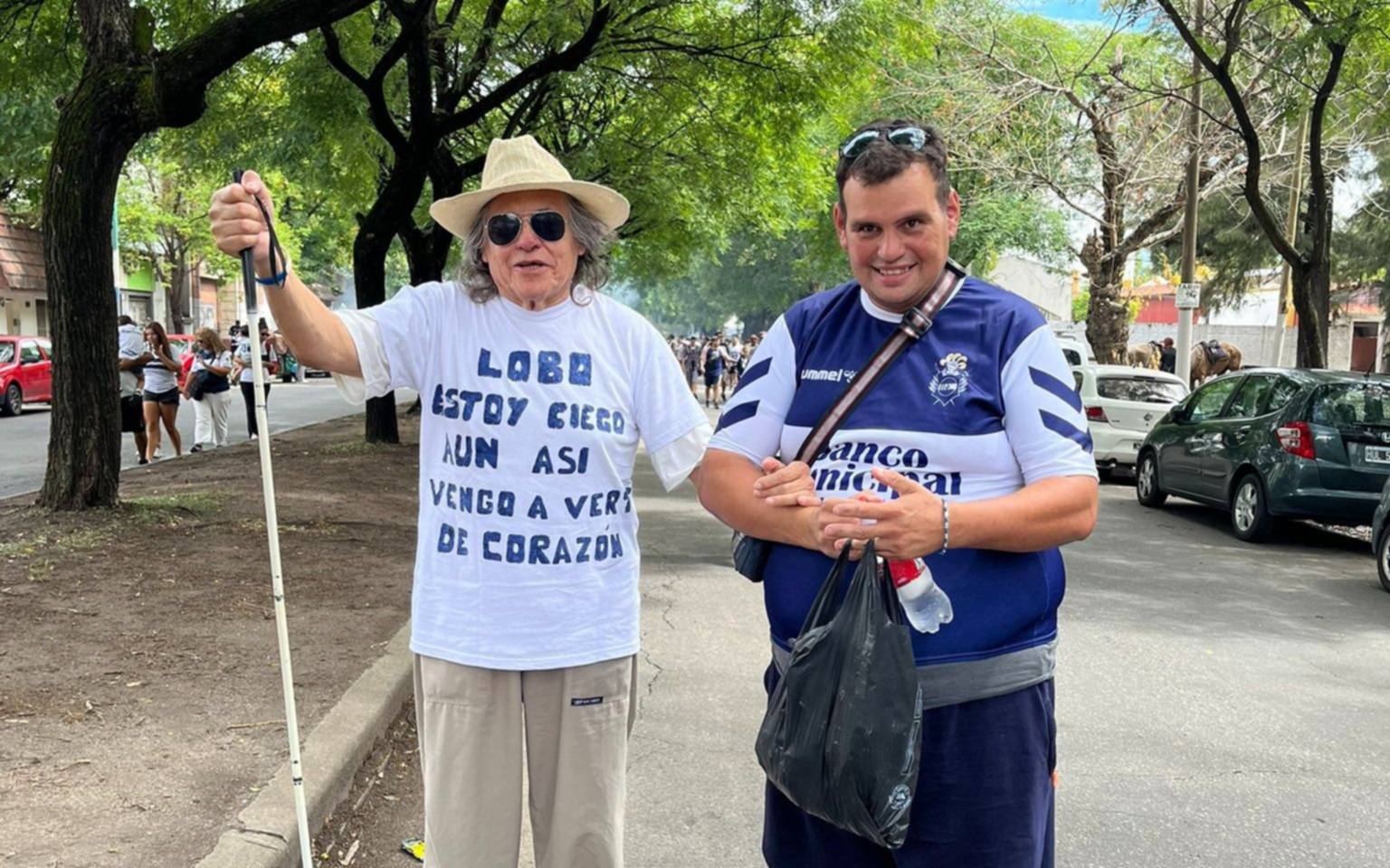 Acompañado por los suyos, Dante llega a la cancha ingresando por avenida 60. Camina tomado del brazo, con paso firme junto a su bastón, como quien conoce de memoria cada rincón. Y lleva una remera blanca que resume todo y que emociona a cualquiera que la lea: “Lobo estoy ciego aún así vengo a verte de corazón”, con letras azules.