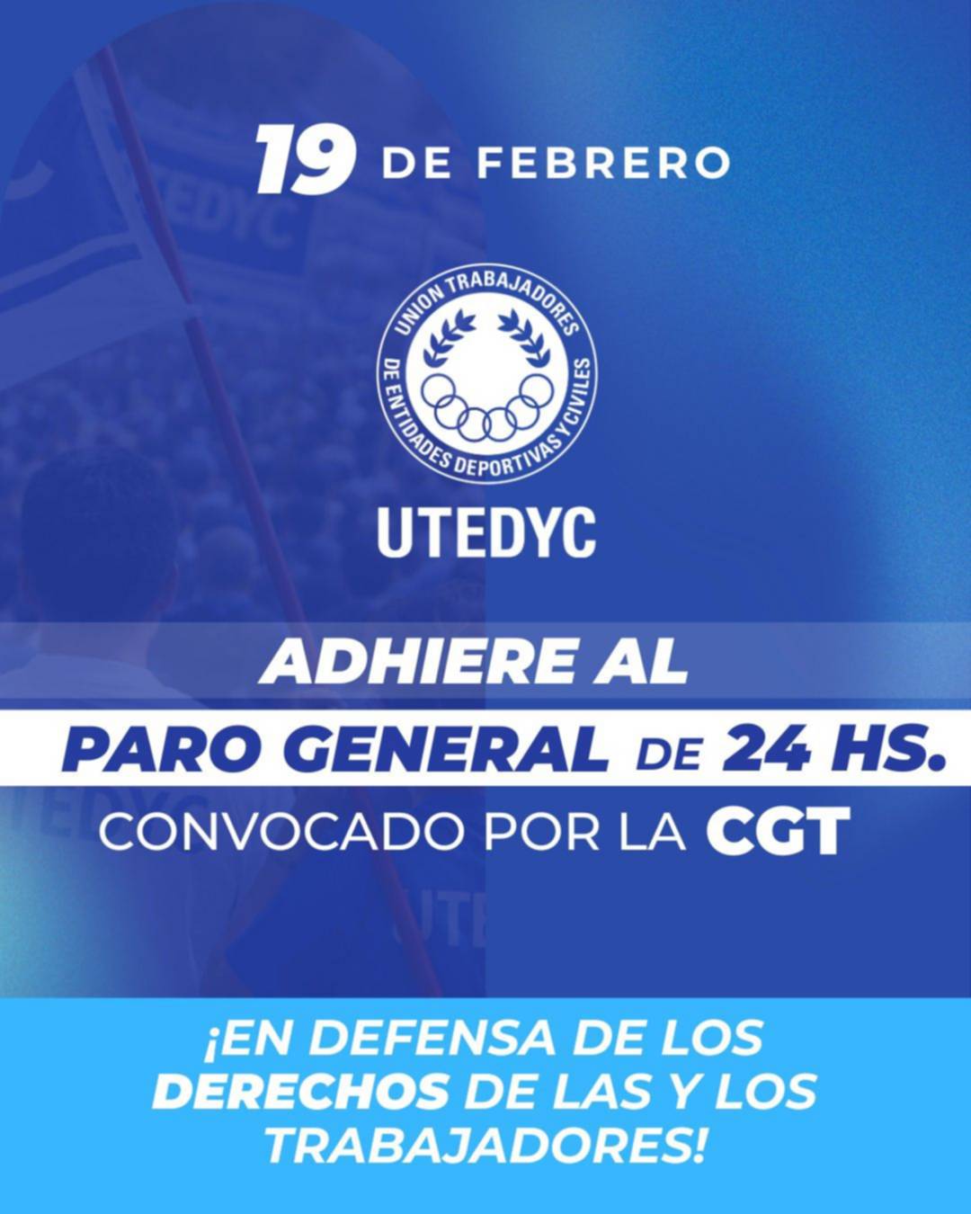 La jornada de partidos programados para este jueves 19 de febrero en el fútbol argentino quedó en duda por la medida de fuerza nacional convocada por la Confederación General del Trabajo (CGT) y la posible adhesión de la Unión de Trabajadores de Entidades Deportivas y Civiles (UTEDYC), el gremio que nuclea al personal clave para el desarrollo de los encuentros.