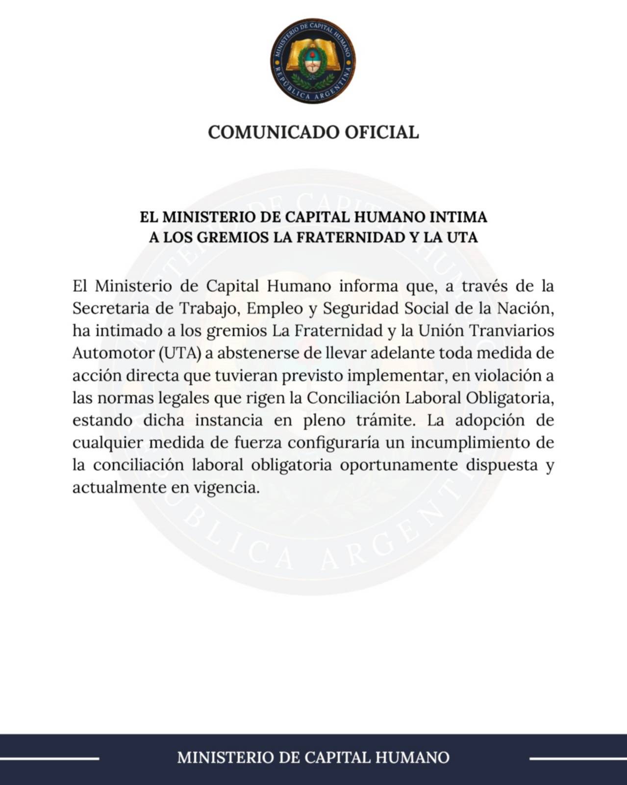 El Gobierno nacional formalizó este martes una intimación dirigida a la Unión Tranviarios Automotor y a La Fraternidad para que se abstuvieran de realizar el paro de transporte previsto desde la medianoche. En el documento, enviado desde el área laboral del Ejecutivo, se advirtió que la eventual concreción de la medida podría derivar en la quita de la personería gremial, al considerar que la suspensión total del servicio afectaría una actividad de carácter esencial para millones de usuarios.