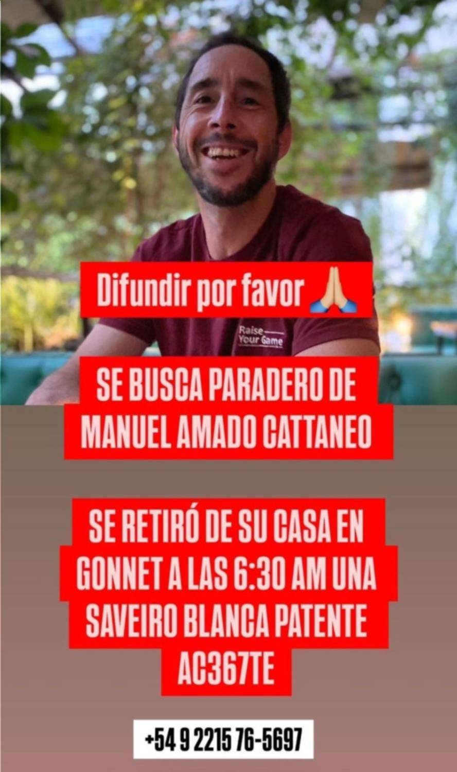 Una familia, tomada por la angustia y el desconcierto, difundió un pedido de ayuda para dar con Manuel Amadeo Cattaneo, un hombre que desapareció en Gonnet hace varias horas.