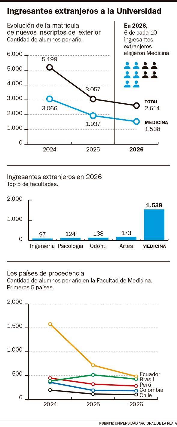 Por segundo año consecutivo volvió a caer la cantidad de estudiantes extranjeros que se inscribieron en la Universidad Nacional de La Plata (UNLP). Sin embargo, la Facultad de Ciencias Médicas sigue concentrando la mayor parte de la demanda: de cada 10 ingresantes de otros países que se anotan en la UNLP, 6 optan por carreras vinculadas a Medicina, una proporción que se mantiene alta pese al descenso general.