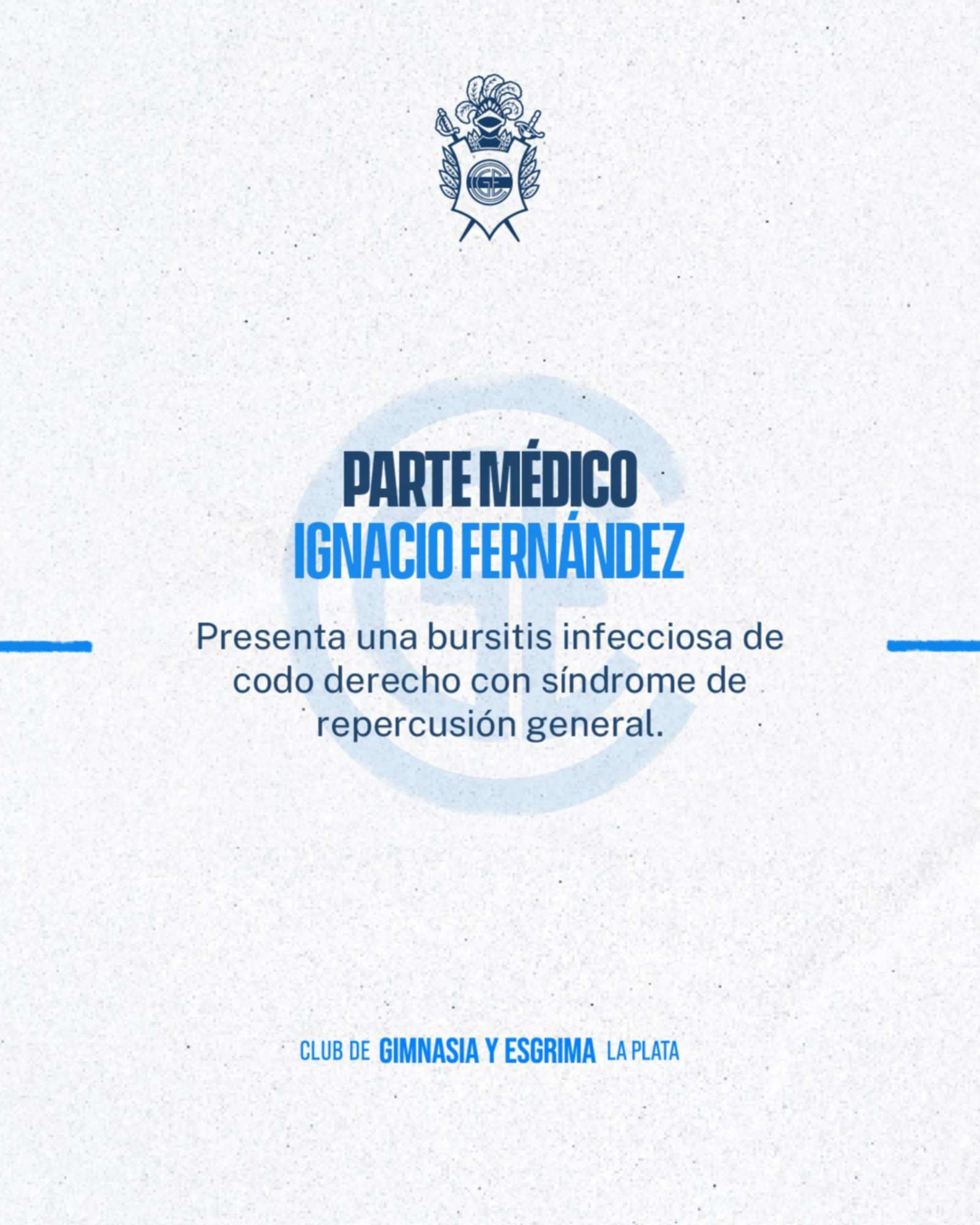 Gimnasia confirmó que Ignacio Nacho Fernández padece una bursitis infecciosa en su codo derecho, acompañada por un síndrome de repercusión general, motivo por el cual no podrá estar presente en el partido de hoy frente a Aldosivi. La institución informó que el mediocampista presenta un cuadro que requiere tratamiento médico inmediato y seguimiento clínico, ya que se trata de una infección que provoca inflamación, dolor y síntomas generales como fiebre o malestar.