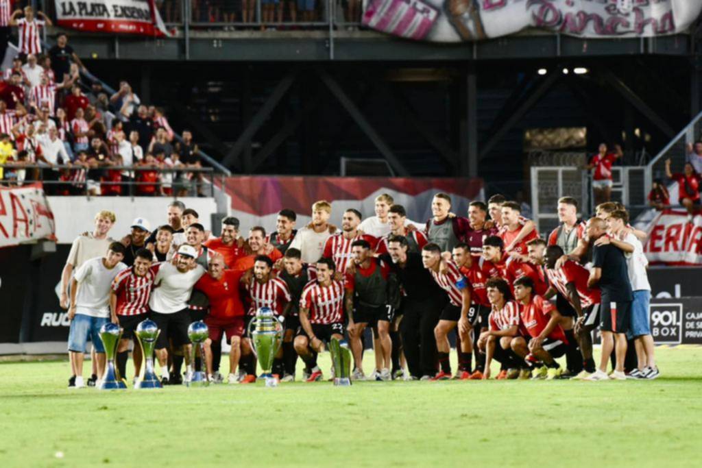 eduardo domínguez junto a los jugadres de estudiantes en el campo de juego tras el triunfo / N.Braicovich