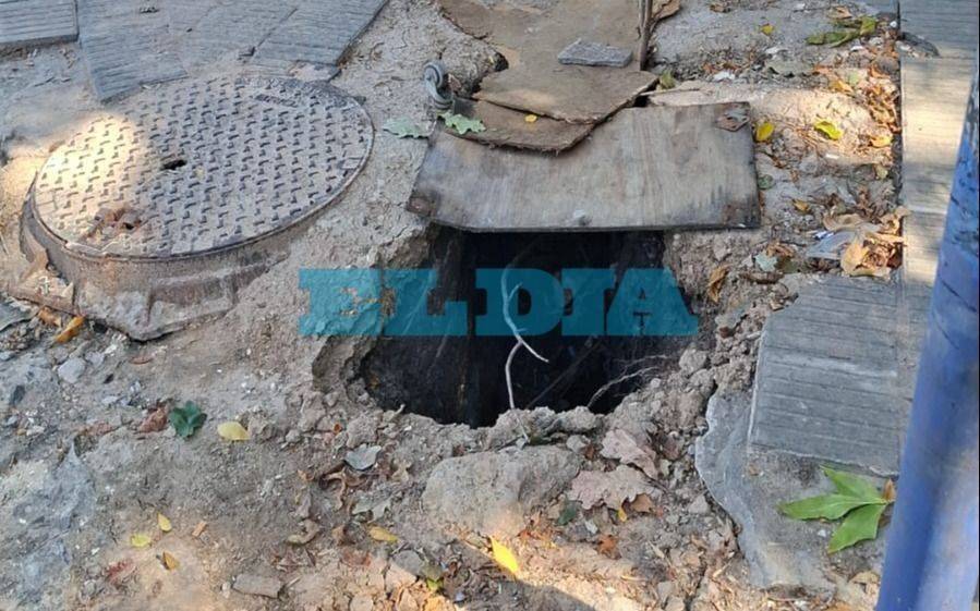 La imagen evidencia el riesgo: el pozo se encuentra sobre la vereda, a pocos centímetros de una tapa de registro y en una zona de tránsito habitual. La profundidad es considerable y deja expuestas instalaciones subterráneas, lo que incrementa el peligro ante una eventual caída, especialmente de niños o personas mayores.