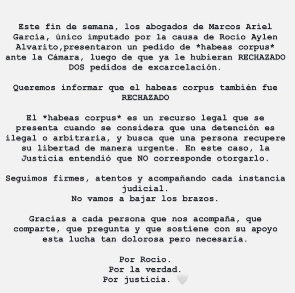 El entorno de Rocío Alvarito mantiene una guardia constante sobre cada instancia del proceso. En sus palabras, el rechazo a la libertad del acusado representa un paso fundamental para garantizar que la investigación no sufra desvíos. La familia agradeció el apoyo de la comunidad platense y ratificó que su lucha se sostiene sobre tres pilares fundamentales: la memoria de Rocío, el acceso a la verdad y el pedido de justicia.