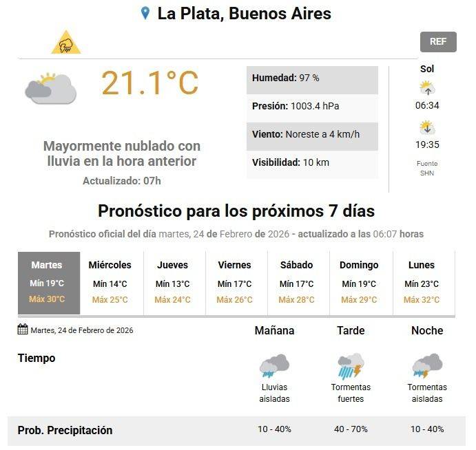 En ese marco el organismo mantiene vigente el alerta amarillo para nuestra ciudad, el cual supone que "el área será afectada por lluvias y tormentas de variada intensidad, algunas localmente fuertes. Las mismas estarán acompañadas por lluvias abundantes en cortos períodos, frecuente actividad eléctrica, granizo y principalmente ráfagas intensas que podrían alcanzar los 70 km/h. Se prevén valores de precipitación acumulada entre 15 y 30 mm, que pueden ser superados de manera puntual".