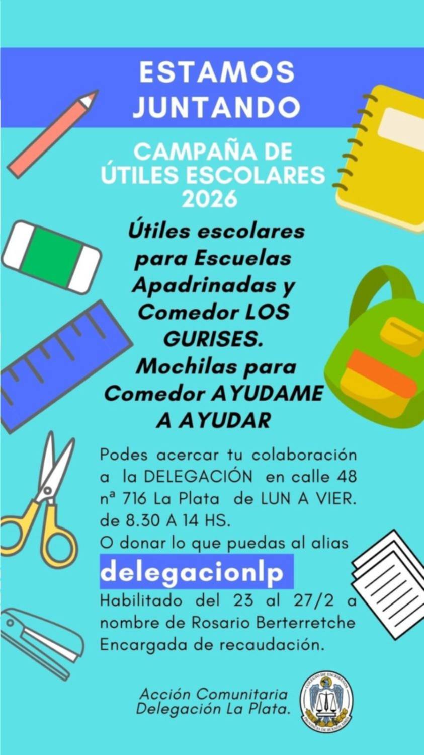 Con el inicio del ciclo lectivo cada vez más cerca, la Delegación La Plata del Colegio de Escribanos de la provincia de Buenos Aires puso en marcha una campaña solidaria para reunir útiles escolares y mochilas destinadas a instituciones que acompañan a niños y niñas en situación de vulnerabilidad.