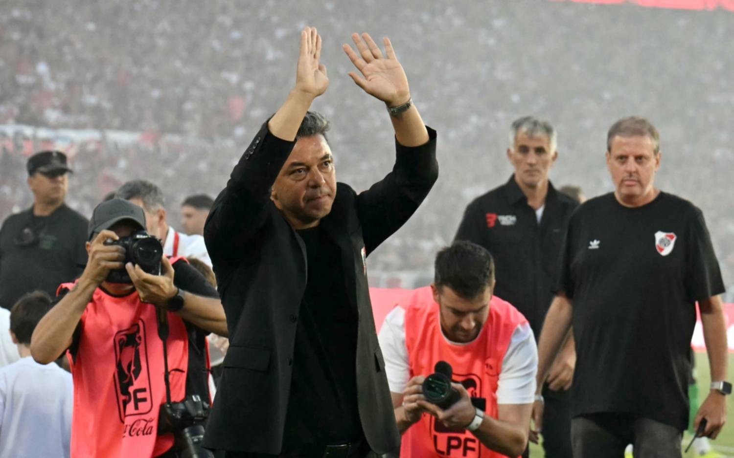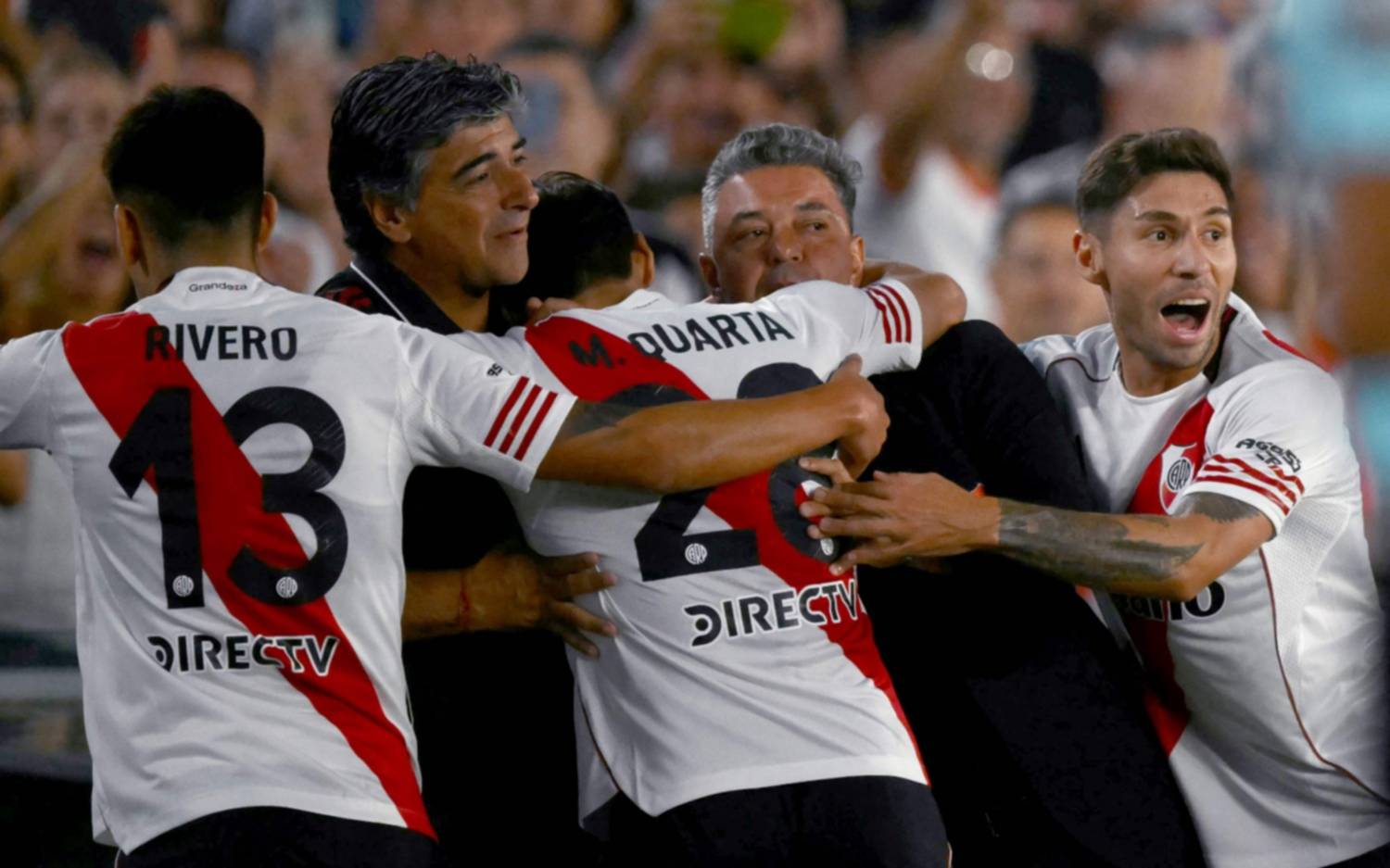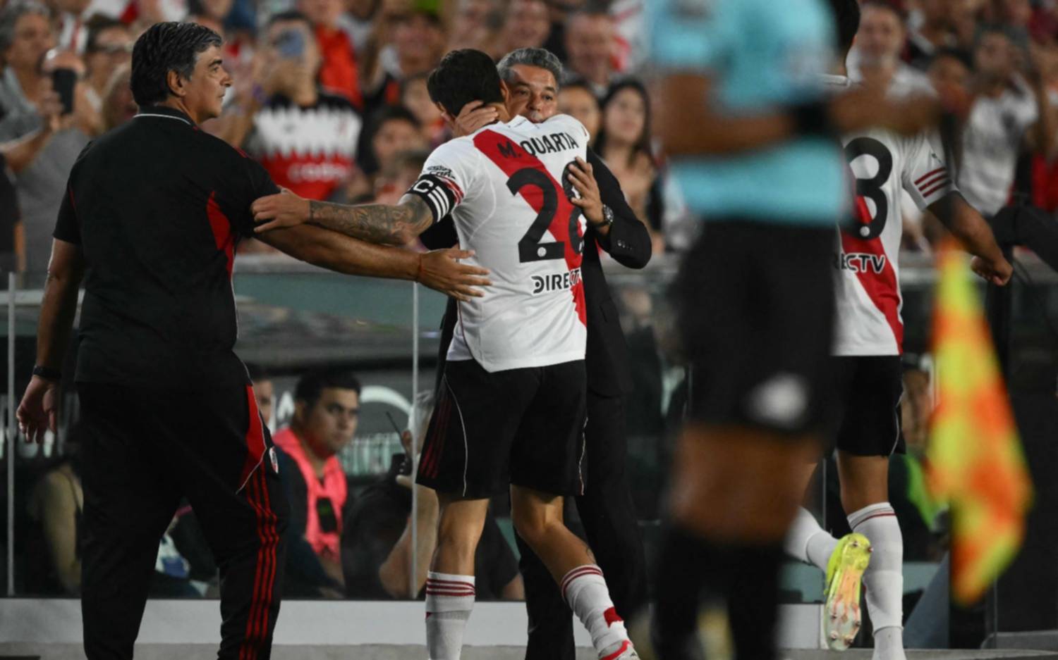 En una tarde emotiva y caliente por la despedida de Marcelo Gallardo, los hinchas se manifestaron en la antesala del encuentro, cuando se dio a conocer la formación por los altoparlantes. Hubo respaldo a los juveniles y reprobación a casi todo el resto, con silbidos para Facundo Colidio, Paulo Díaz, Kevin Castaño, Marcos Acuña, Matías Viña, Giuliano Galoppo, Sebastián Driussi, Fabricio Bustos y Lucas Martínez Quarta. Además, respondió a la mención de Marcelo Gallardo con un aplauso unánime y el canto “muñeco, muñeco...”.
