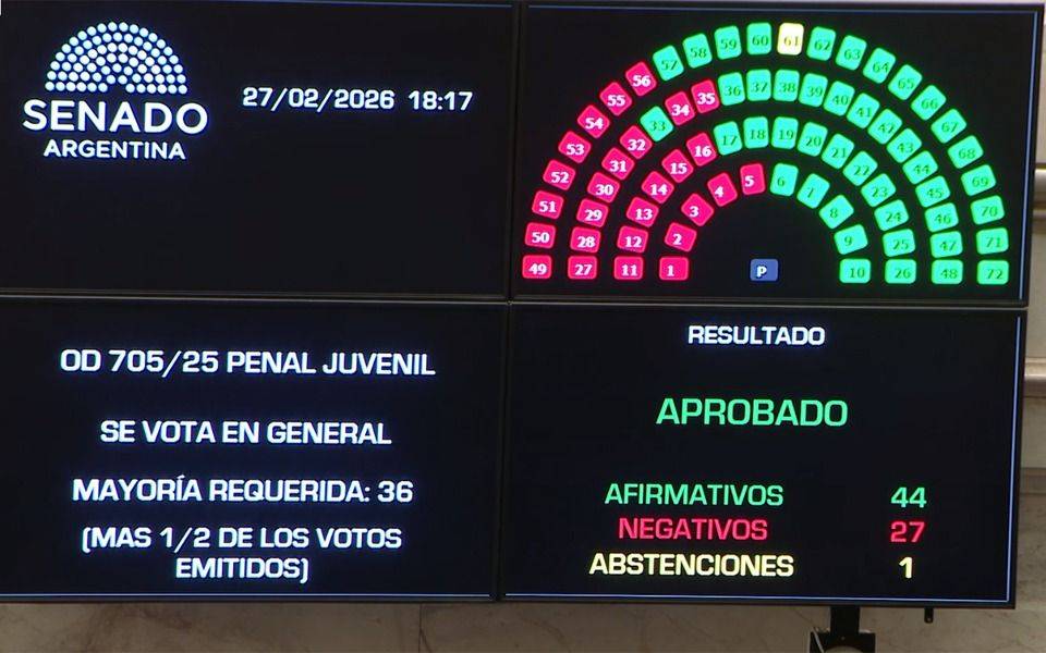 El Senado aprobó este viernes la baja de edad de imputabilidad de los menores de 16 a 14 años con la reforma de la Ley Penal Juvenil. La votación resultó 44 votos positivos y 27 negativos.