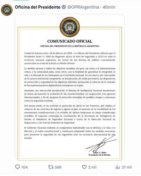 “El Gobierno Nacional reafirma su compromiso indeclinable con la defensa a la vida, a la libertad y al orden constitucional, y continuará adoptando todas las medidas necesarias para preservar la seguridad de los argentinos ante un escenario internacional de alta tensión”, concluyó el comunicado.