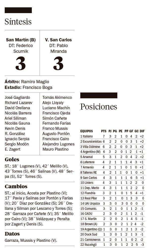 Pero de manera increíble, el final fue una pesadilla para San Carlos, ya que San Martín logró el empate en una ráfaga: a los 48´Serpa puso el 2-3 de penal y a los 52´, Torres convirtió el 3-3 con un cabezazo agónico. Hubo tumulto en el final entre los dos equipos.