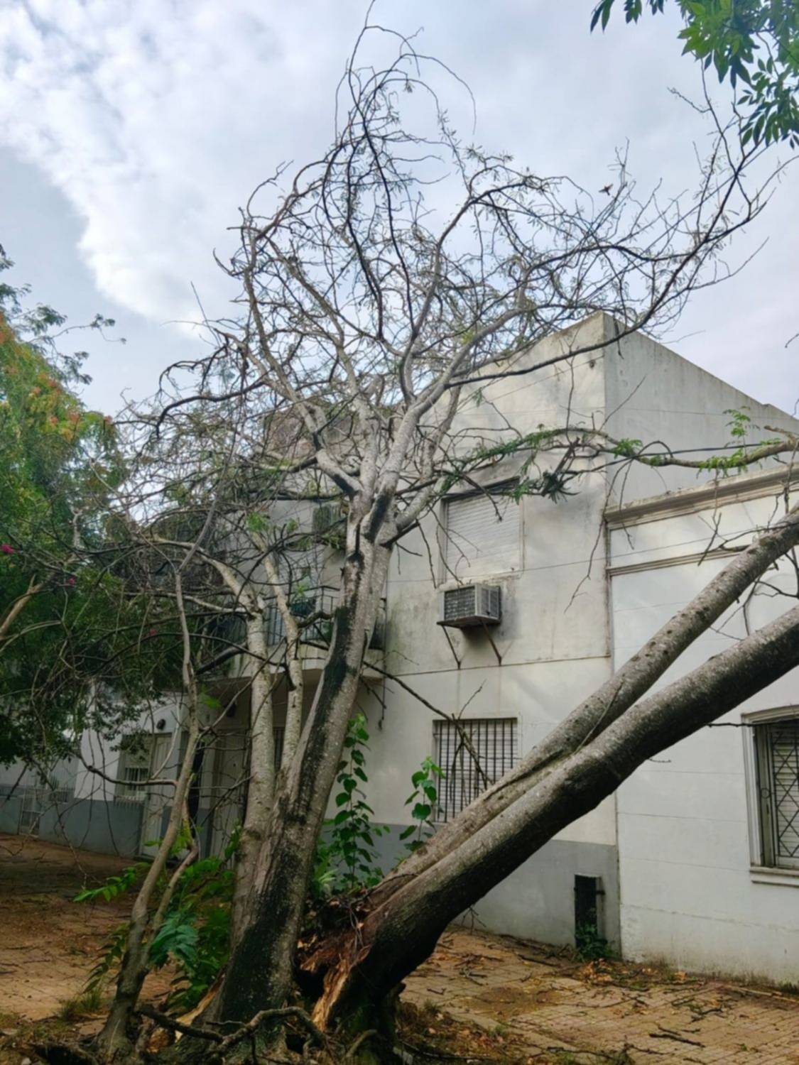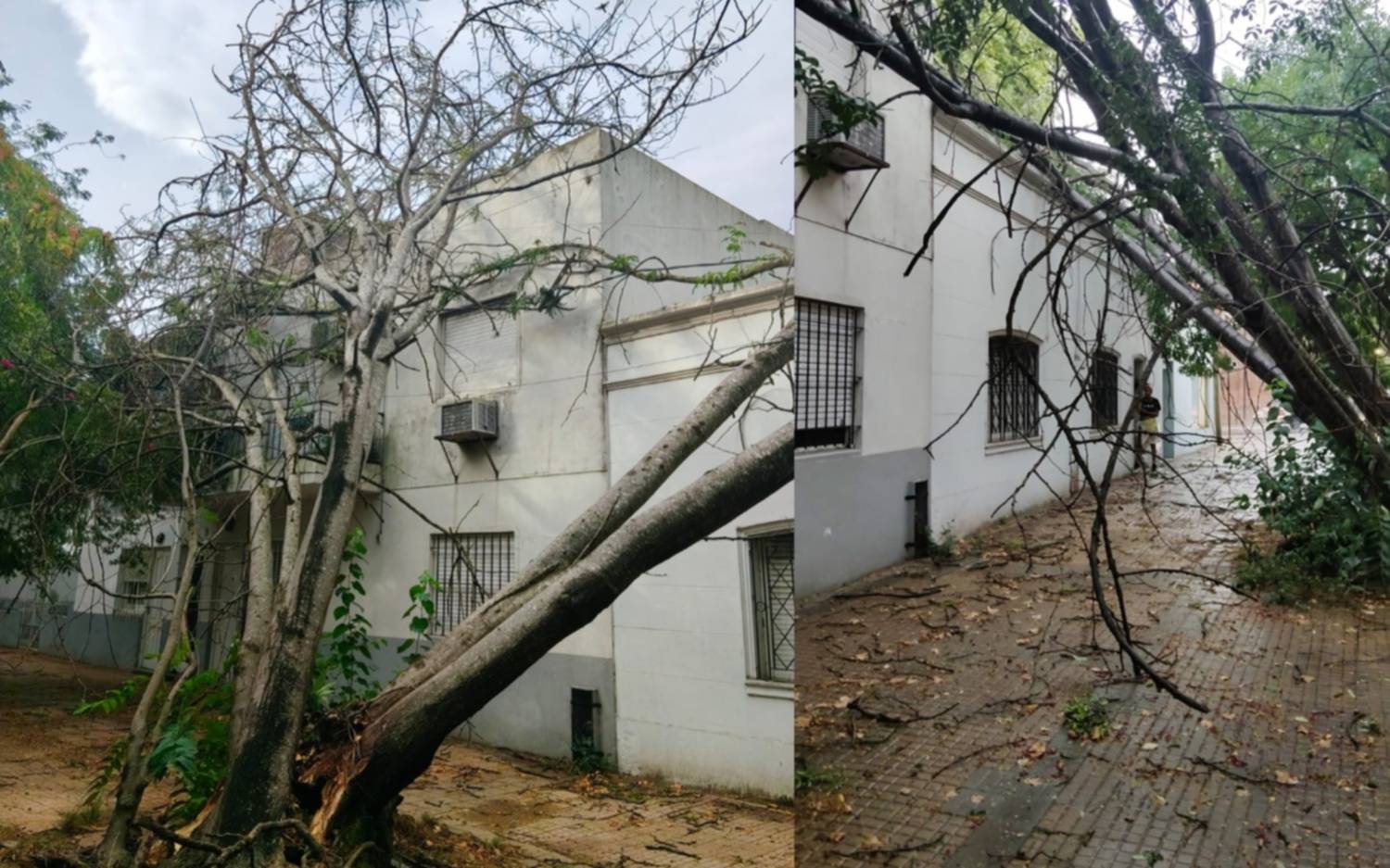 El árbol en cuestión se derrumbó “sobre una casa y departamentos”. Según se puede ver en las imágenes, ocupa todo el ancho de la vereda.