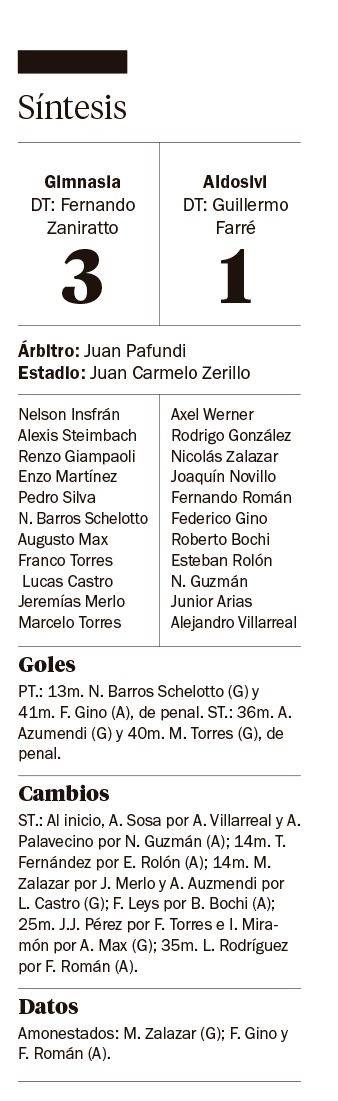 Más allá de aquel remate de Franco Torres en el inicio del complemento, un tiro libre de Barros Schelotto había llegado algo de peligro al arco de Aldosivi. Con las variantes, Gimnasia no encontró juego, pero fue agresivo y fue a buscar el triunfo.
