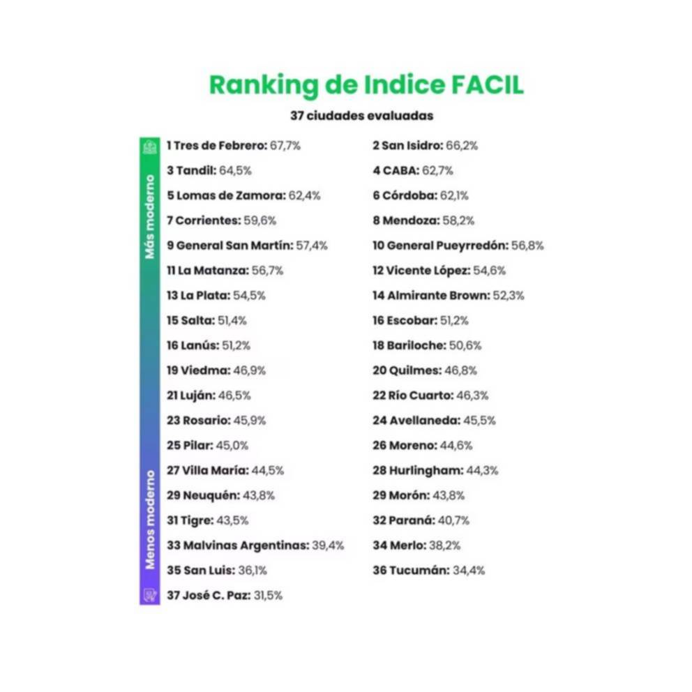 En el ranking nacional, Tres de Febrero lidera con 67,7%, seguido por San Isidro y Tandil. La Ciudad Autónoma de Buenos Aires quedó cuarta. En el extremo opuesto figuran algunos municipios con los puntajes más bajos. Nuestra ciudad, que tiene en funcionamiento el CAM (Centro Administrativo Municipal de diagonal 80 y 48), ocupa el 13º lugar, apenas por debajo de Vicente López y por encima de Almirante Brown.
