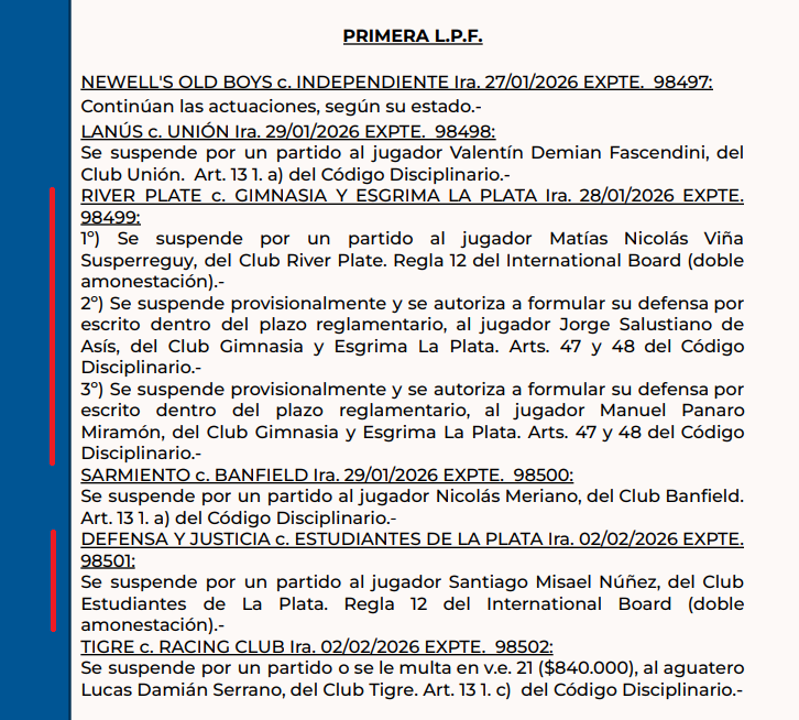 En el caso de Gimnasia, todavía no se definió la cantidad de fechas de suspensión para Manuel Panaro ni para Jorge de Asís, quienes fueron expulsados en el encuentro frente a River Plate. Sin embargo, ambos quedaron suspendidos de manera provisional y no podrán estar presentes en la próxima fecha, cuando el Lobo visite a Barracas Central.