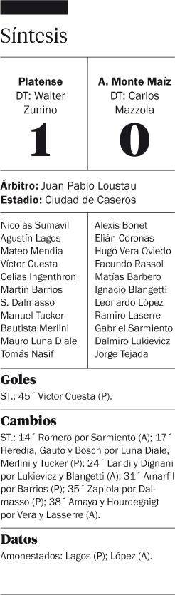 Zunino mandó a los titulares a la cancha y el Calamar arrinconó en los minutos finales a su rival. A los 40 minutos, logró el tanto clave: luego de un buen tiro libre de Gauto, Víctor Cuesta anticipó a todos en el área y marcó el 1-0 con un implacable cabezazo. Los minutos corrieron y más allá de tener otra chance clara con Nasif, Platense lo ganó por la mínima en Caseros.