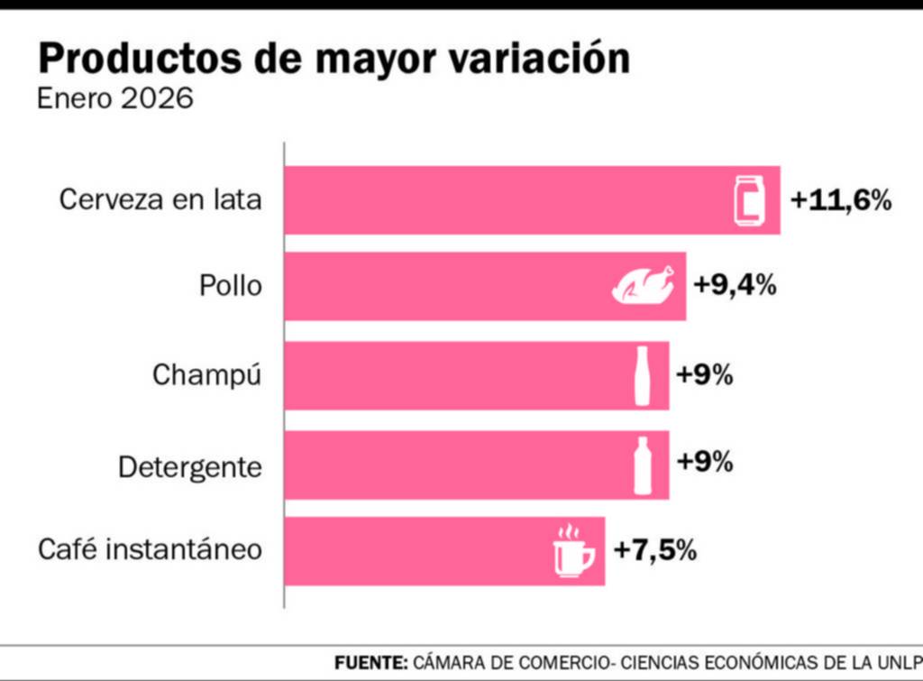El informe técnico detalla que, para llegar al número final de 2,4%, los alimentos aportaron 1,5 puntos porcentuales del total. En detalle, se observa que la subida se concentró especialmente en productos de consumo masivo, en casos, ineludibles para la mesa familiar. La cerveza en lata encabezó las subas con un 11,6%, seguida por el pollo, que registró un aumento del 9,4%. En las góndolas de higiene personal y limpieza, tanto el champú como el detergente mostraron un alza idéntica del 9%. Por último, el café instantáneo, completó el cuadro de los productos con mayor impacto con un 7,5%.