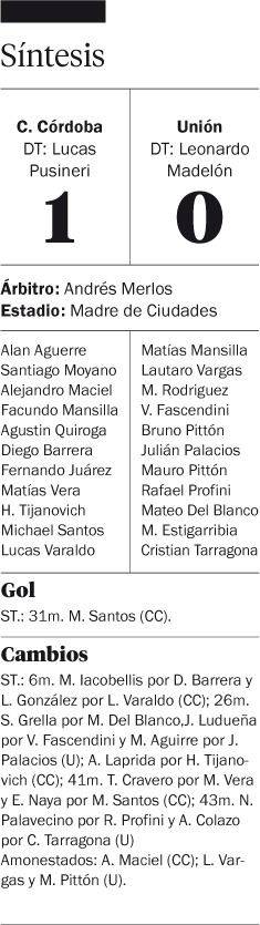 Central Córdoba se sacó la mufa en el Apertura. El Ferroviario consiguió su primer gol en el campeonato y alcanzó también el primer triunfo contra Unión por 1-0, en el estadio Madre de Ciudades. El único gol lo anotó Michael Santos, de cabeza, a los 31 minutos del complemento, y resultó ser un alivio para el local.