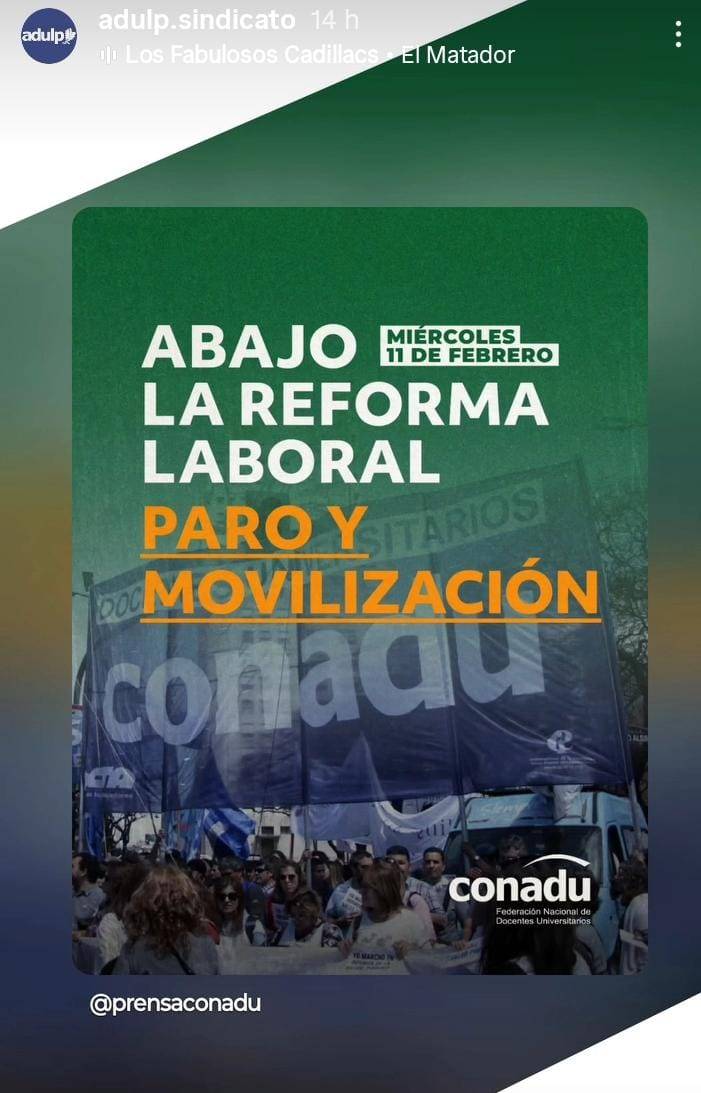 ADULP se alineó a la determinación de la Federación Nacional de Docentes Universitarios (CONADU), que en el plenario de ayer resolvió "como primera medida, realizar paro y movilización el 11 de febrero contra la reforma laboral".