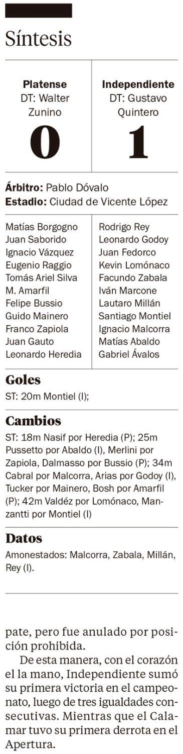 Independiente derrotó 1-0 a Platense en Vicente López, y sumó su primera victoria en el Torneo Apertura, luego de tres empates consecutivos. Santiago Montiel la llave del gol