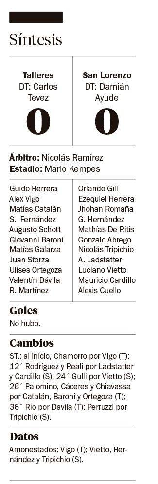 En el estadio Mario Alberto Kempes, Talleres y San Lorenzo igualaron 0-0 en un encuentro intenso y de ocasiones en ambos lados. De esta manera, los dos continúa con andar irregular en el Torneo Apertura.