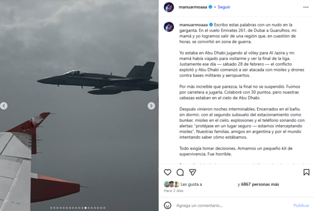 Ya a salvo, Armoa decidió compartir en redes sociales una carta en la que relató lo vivido. “Escribo estas palabras con un nudo en la garganta. En el vuelo de Dubái a Guarulhos, mi mamá y yo logramos salir de una región que en cuestión de horas se convirtió en zona de guerra”, expresó el jugador argentino, todavía conmocionado por la experiencia.