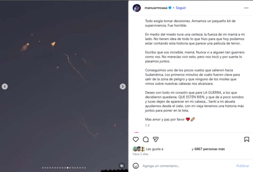 Las familias en Argentina y en distintas partes del mundo seguían cada noticia con preocupación, intentando comunicarse para saber si estaban a salvo. Ante el avance del conflicto, ambos prepararon un pequeño kit de supervivencia mientras evaluaban cómo salir del país.