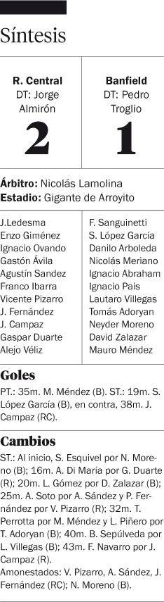 Rosario Central se impuso anoche por 2-1 a Banfield, en un partido celebrado en el Gigante de Arroyito. El Talador lo ganaba con un tanto de Mauro Méndez (ex Estudiantes), pero Angel Di María ingresó en el complemento y desde su zurda el Canalla lo dio vuelta: lo empató de cabeza Santiago López García (en contra) y Jaminton Campaz, por la misma vía, le dio la victoria al local a poco del final.