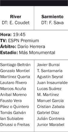 Esta tarde desde las 19.45, River recibe a Sarmiento en el Más Monumental, por la decimoprimera fecha del Torneo Apertura, en lo que será el primer partido de Eduardo Coudet ante su gente.