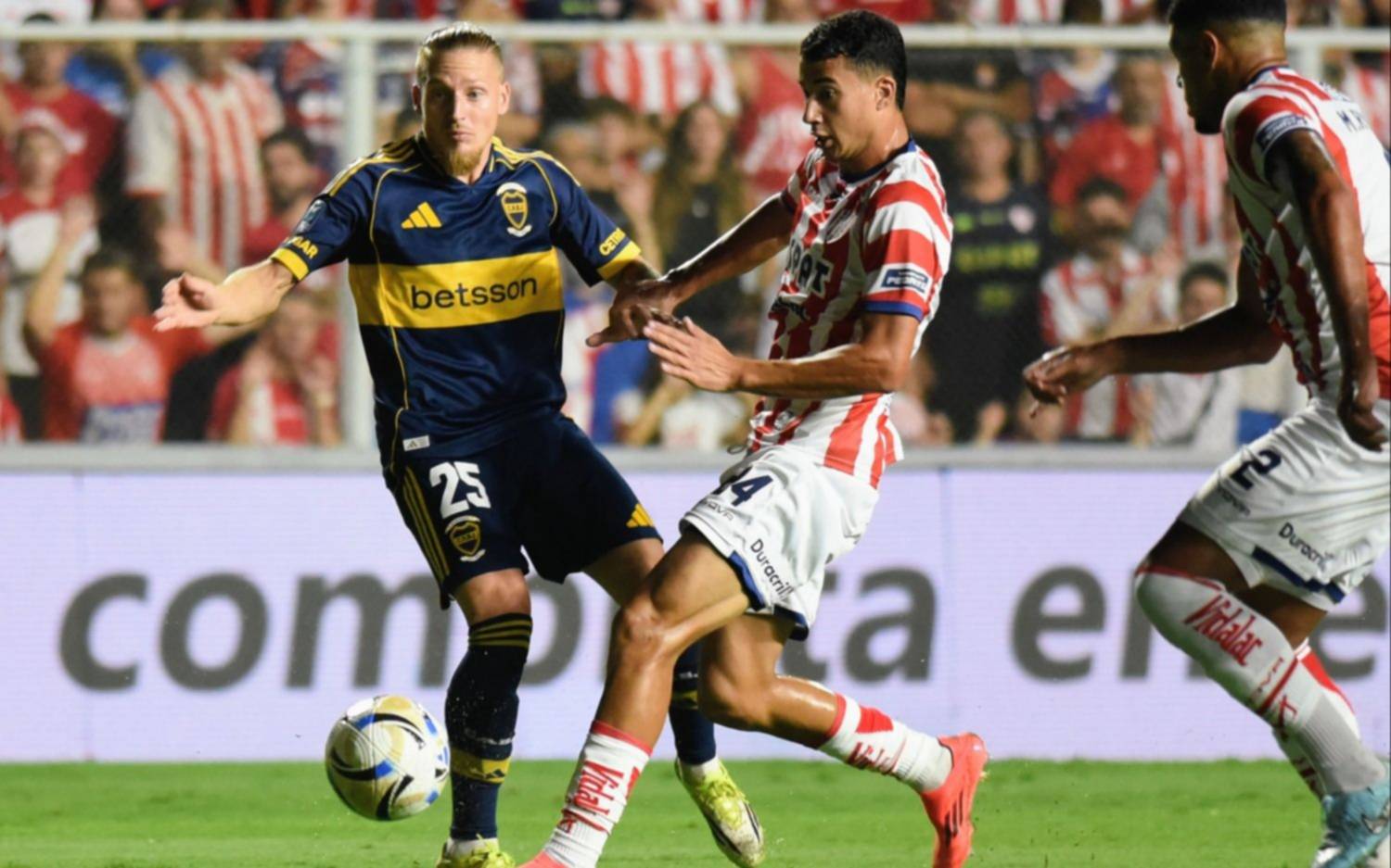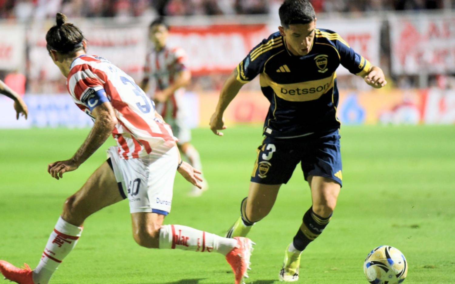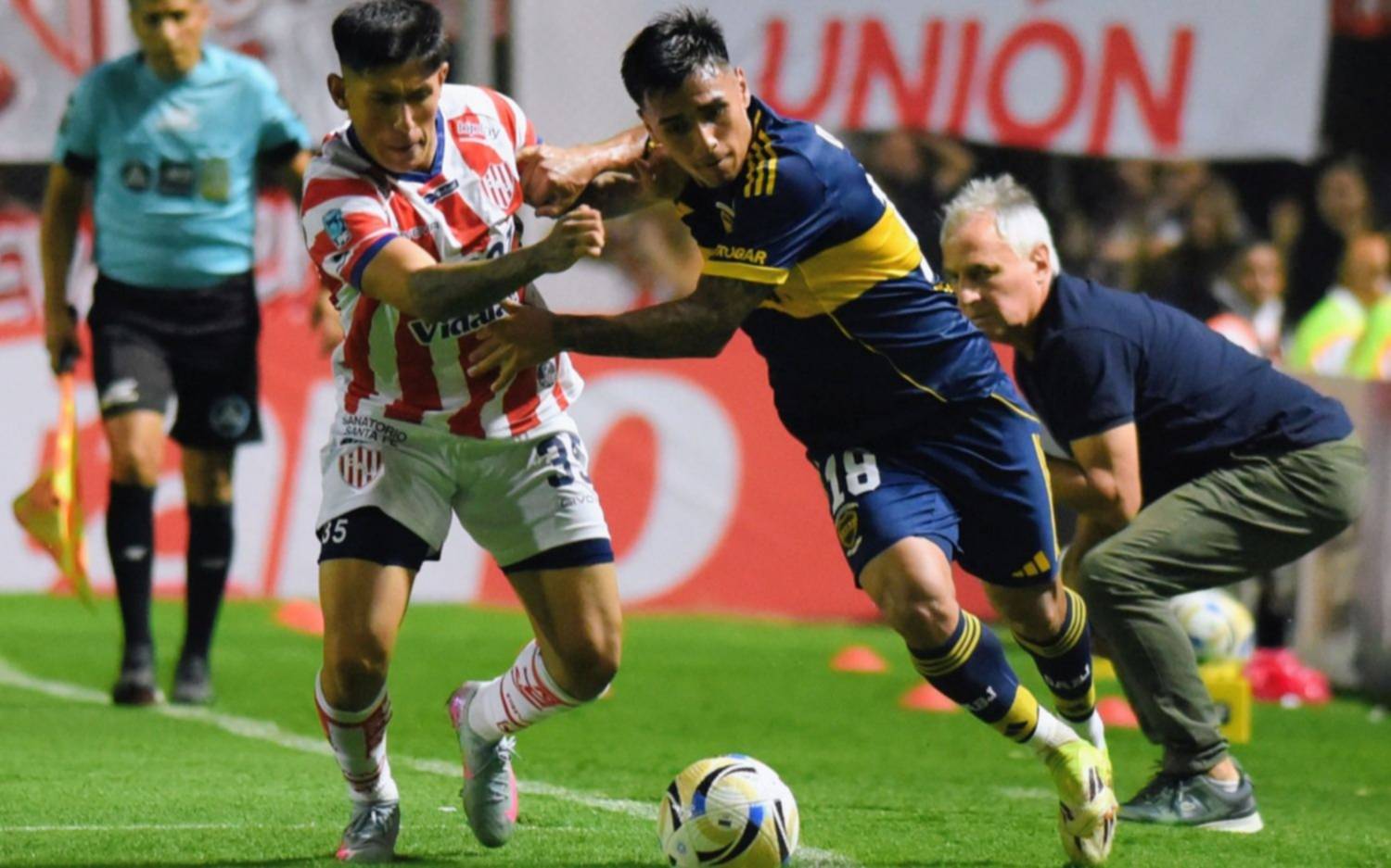 La primera mitad tuvo un desarrollo parejo, con pocas ocasiones claras de gol. Unión mostró mayor presencia en los primeros minutos, mientras que Boca respondió con intentos de Miguel Merentiel y remates de Marcelo Weigandt desde fuera del área. Ambos equipos se controlaron en el mediocampo, con tarjetas amarillas para Tomás Aranda y Santiago Ascacíbar por parte de Boca, y Brahian Cuello en Unión. A pesar de los intentos de Boca desde pelota parada y córners, fue Unión quien logró abrir el marcador justo antes del final del primer tiempo.