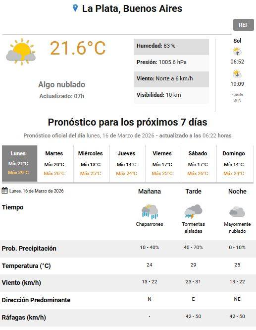 La semana comienza inestable en La Plata y alrededores, según las previsiones del Servicio Meteorológico Nacional (SMN).