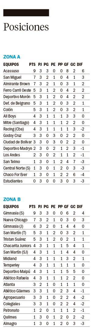 En un domingo a puro fútbol en la Primera Nacional, Acassuso derrotó 3-2 a San Telmo en condición de visitante y es el nuevo líder de la Zona A con 9 puntos. En tanto que en el Grupo B, Gimnasia y Tiro de Salta también lidera lidera con puntaje ideal.