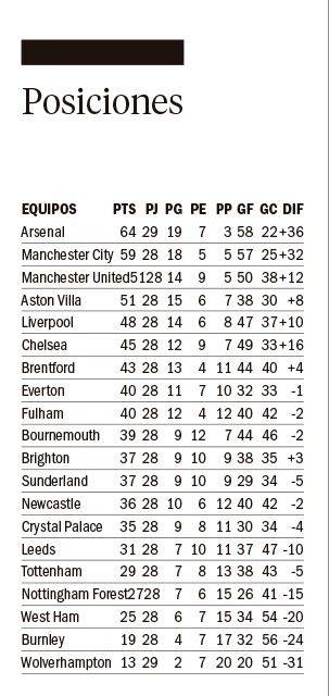 El equipo de Mikel Arteta cuenta con un colchón de cinco puntos sobre su inmediato perseguidor, Manchester City, con 28 fechas disputadas. Aunque el Arsenal ha disputado un partido más.