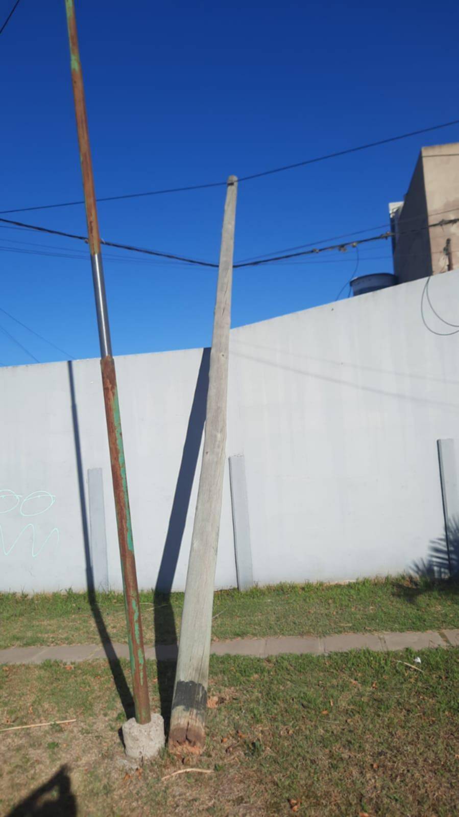 En 42, 155 bis y 156, reclaman ante el peligro que representa un poste del cableado público quebrado en la base, caído sobre la pared de una vivienda. “Hay varios reclamos. Es un palo de luz sobre los cables y una casa”, dijo un vecino.