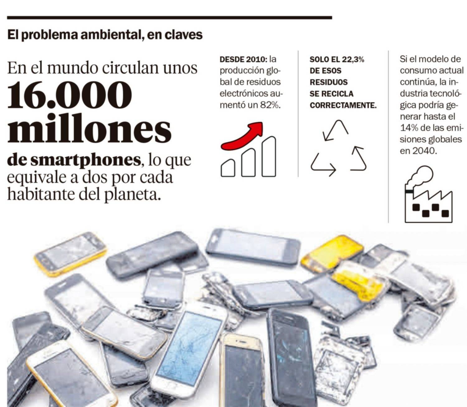 Las cifras ilustran el problema. En la actualidad circulan en el mundo unos 16.000 millones de smartphones, lo que equivale a aproximadamente dos por cada habitante del planeta. Al mismo tiempo, la producción global de residuos electrónicos creció más de un 80% desde 2010.