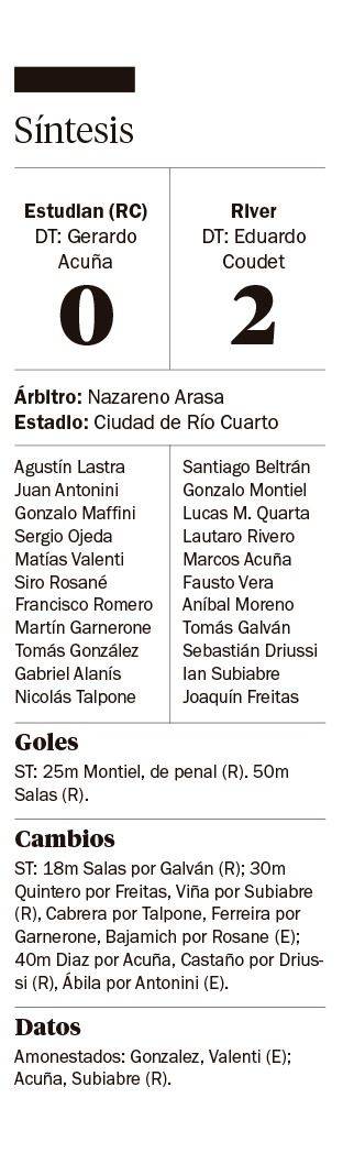 Con la intervención del VAR en jugadas claves del partido, el Millonario fue eficaz se impuso 2-0 ante Estudiantes (RC) en Córdoba. Gonzalo Montiel y Maxi Salas los autores de los goles