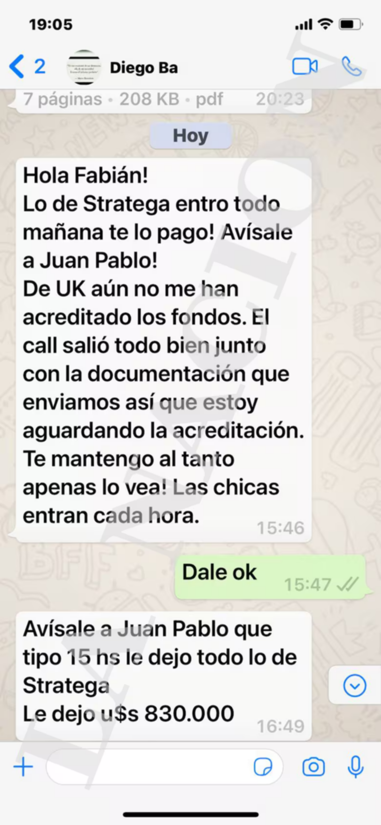 Los chats analizados en la causa dan cuenta de un mecanismo de “delivery” de dinero. En uno de los mensajes citados, el financista le avisa a Beacon que tenía “830” para entregarle y acuerdan un punto de encuentro habitual en la calle Lavalle, lo que, según la investigación, equivaldría a 830.000 dólares.