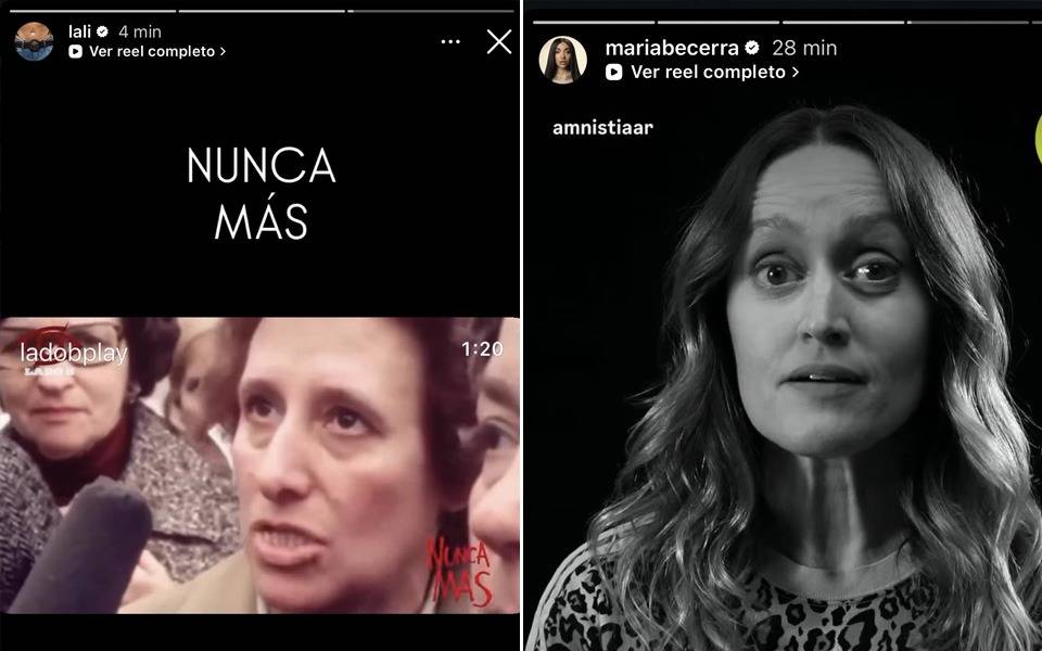 Por otro lado, Lali Espósito replicó una acción similar y difundió material audiovisual con testimonios de Madres de Plaza de Mayo y Abuelas de Plaza de Mayo, también, sumó la consigna “Nunca más”.