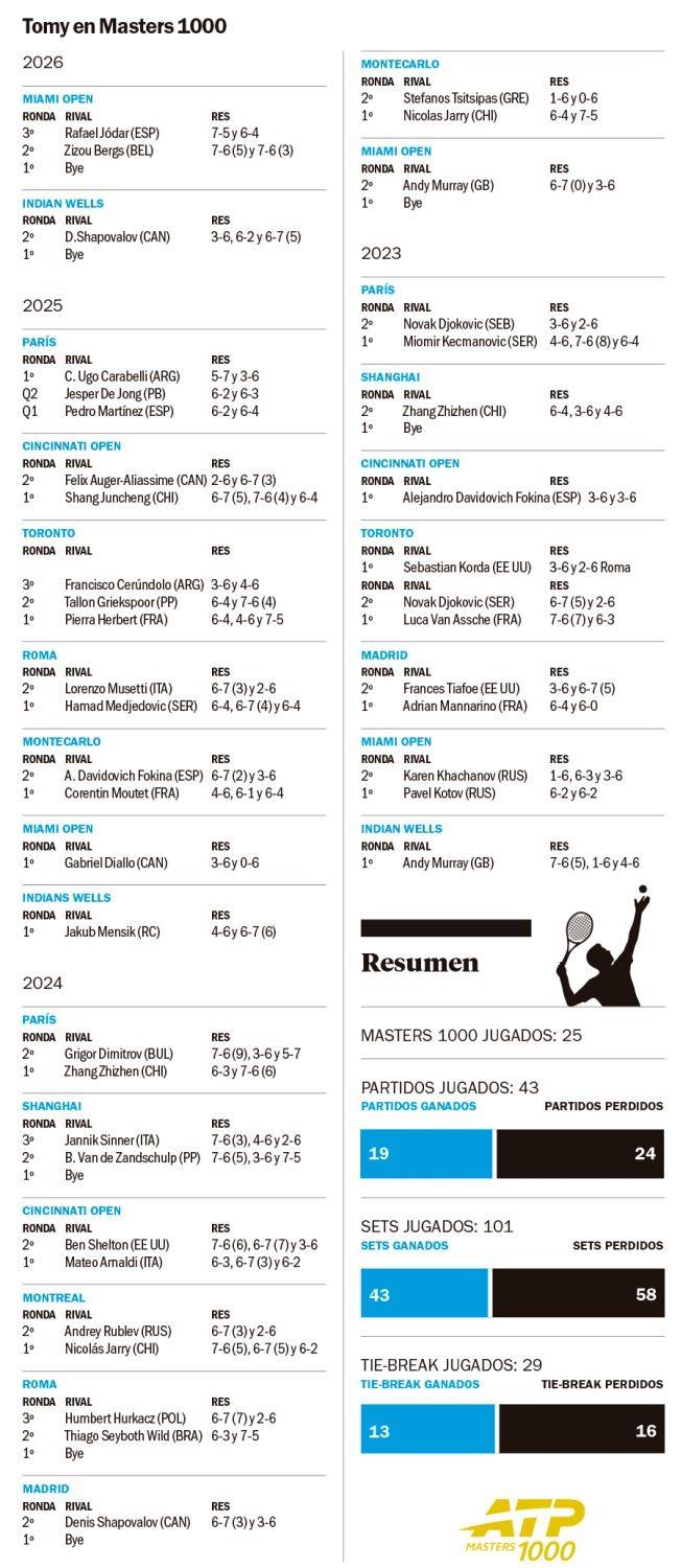 Tomás Etcheverry (32) buscará hoy meterse entre los ocho mejores jugadores del Masters 1000 de Miami. Sin lugar a dudas no será una empresa fácil para el tenista platense, ya que se estará midiendo con el estadounidense Tommy Paul (23 del mundo); aunque en el nivel que se encuentra exhibiendo Tomy en este torneo no hay misión imposible.