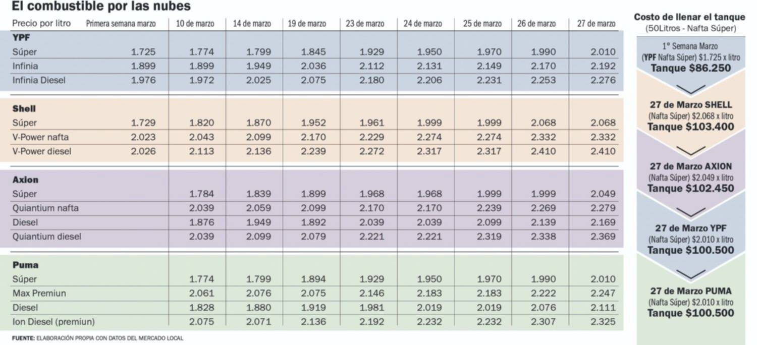 El aumento de precios se inició el 1° de marzo, tras la actualización parcial de los impuestos a la nafta y el gasoil dispuesta por el Gobierno nacional. Desde entonces, las subas continuaron los días 10, 14, 19, 23 y 24, en un contexto marcado por la tensión en Medio Oriente, que presiona al alza el precio internacional del barril de Brent. La tendencia se mantuvo en los últimos días: entre el 23 y el 27 de marzo, donde se registraron cinco incrementos en una misma semana.