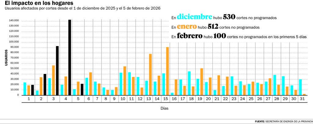 Según ese mismo informe, entre el 1° de diciembre de 2025 y el 5 de febrero de este año se registraron 1.142 cortes. Los cortes no pararon hasta estos últimos días, según las quejas que recibe este diario.