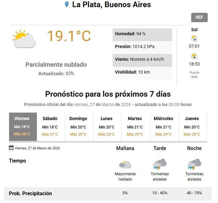 Las malas noticias en cuanto al tiempo en La Plata continúan ya que el SMN adelantó que mañana sábado será una jornada pasada por agua. La amenaza de tormentas aisladas se mantendrá durante la madrugada y la mañana, y por la tarde se vienen los chaparrones. Recién mejorará a la noche cuando el cielo esté parcialmente nublado. Además el termómetro oscilará entre los 18 y los 27 grados.