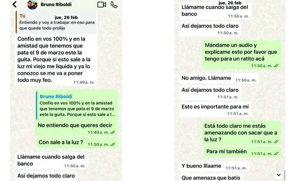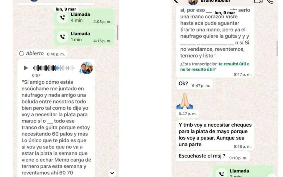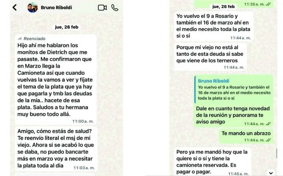 Según surge de las conversaciones, el conflicto no se habría originado en un robo, sino en una urgencia económica. El 26 de febrero, Riboldi le transmite a su socio la presión familiar por la compra de una camioneta y le fija un plazo concreto para reunir el dinero: necesitaba disponer de los fondos en marzo. En ese mismo intercambio, deja entrever la sensibilidad de la situación: advertía que, si la maniobra trascendía, tendría consecuencias personales.