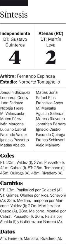 Independiente clasificó a los 16avos de final de la Copa Argentina al vencer cómodamente a Atenas de Río Cuarto. El Rojo se impuso 4 a 2 con tantos de Facundo Valdez, Ignacio Pussetto, Luciano Cabral y el ingresado Felipe Tempone.