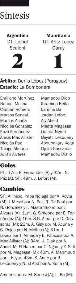 Un amistoso con tinte de entrenamiento con público. Vaya a saber qué conclusiones podrá sacar Lionel Scaloni, pero fue la único que pudo conseguirle la AFA para esta fecha FIFA. Cómo habrá sido de desabrido el menú que ni siquiera Lionel Messi jugó como titular. La Selección le ganó 2-1 como local en la Bombonera a Mauritania, un combinado de tercer orden mundial en la previa de la copa que reunirá a las “mejores” selecciones del planeta.
