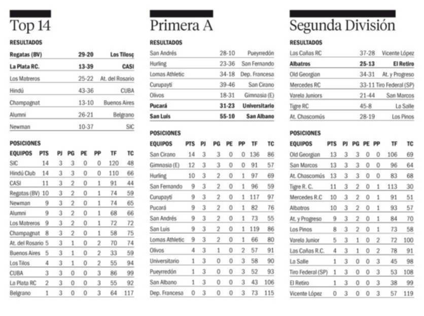Tantos 13’ y 24’ penales J. Akemeier ( C);15’ Penal S. Di Lucca (LP); 35m. Try J. Torres Obeid convertido por J. Akemeier (C );. Parcial La Plata 3 - CASI 13. ST 8’ . Penal S. Di Lucca (LP); 12’ Try J. Torres Obeid convertido por J. Akemeier (C ); 17’ Try penal ( C ); 20’ Try F. Hileman (C); 27’ Try I. Kucic convertido por S. Di Lucca (LP); 42’ Try T. Phelan convertido por J. Akemeier (C ).
