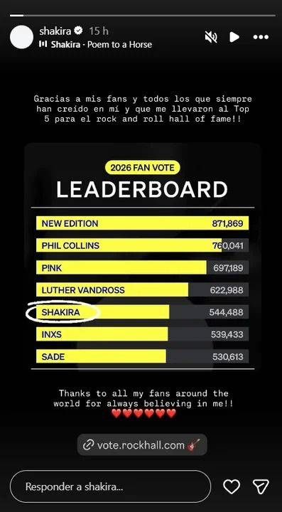 “Gracias a mis fans y a todos los que siempre han creído en mí y que me llevaron al Top 5 para el Rock and Roll Hall of Fame”, agradeció Shakira en sus redes.