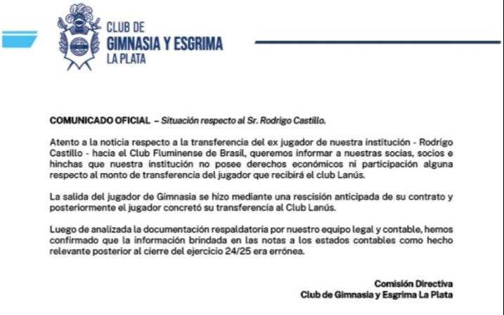 Gimnasia reconoció además que un error en la información publicada en estados contables por la Comisión Directiva anterior había generado confusión al indicar que el club tenía un 20 por ciento de los derechos sobre el pase de Castillo. La nueva conducción aclaró que esa proporción no corresponde y que, por lo tanto, no habrá ingreso por esa vía.