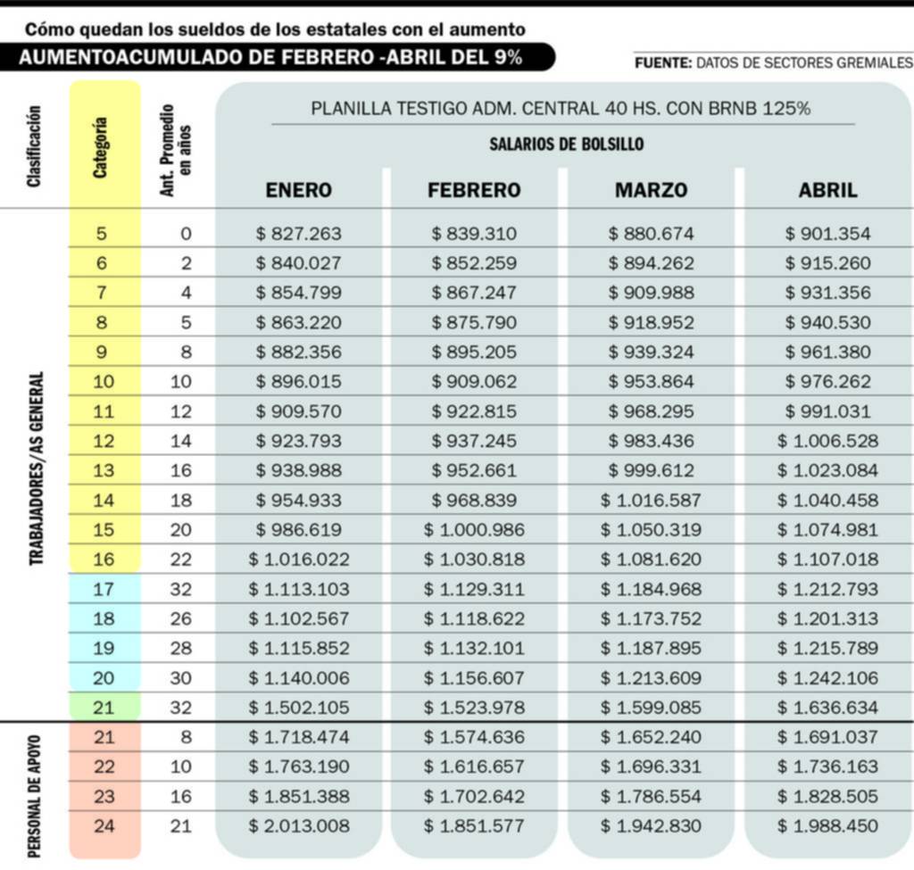Después que los gremios que representan a los trabajadores estatales bonaerenses aceptaron la propuesta salarial presentada por el gobierno de Axel Kicillof, en el marco de las negociaciones paritarias, quedaron definidos los incrementos que tendrá cada categoría (ver cuadro aparte). El acuerdo contempla un aumento del 9% en tres tramos y una nueva instancia de revisión en los próximos meses.